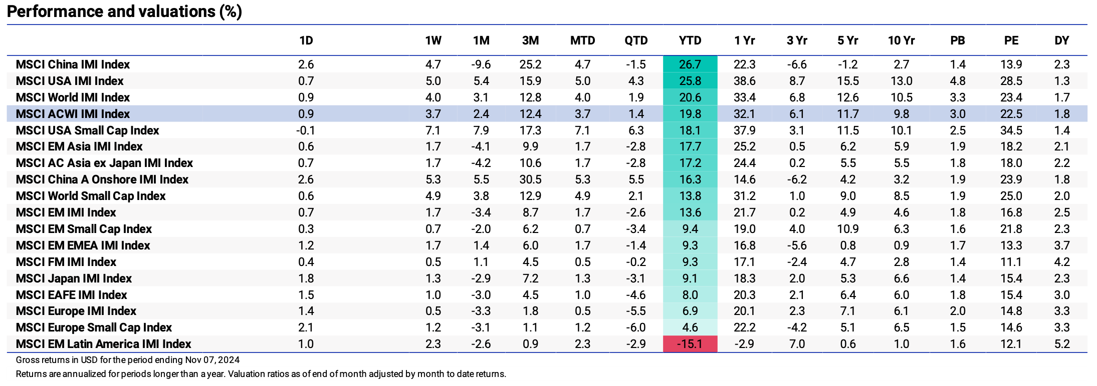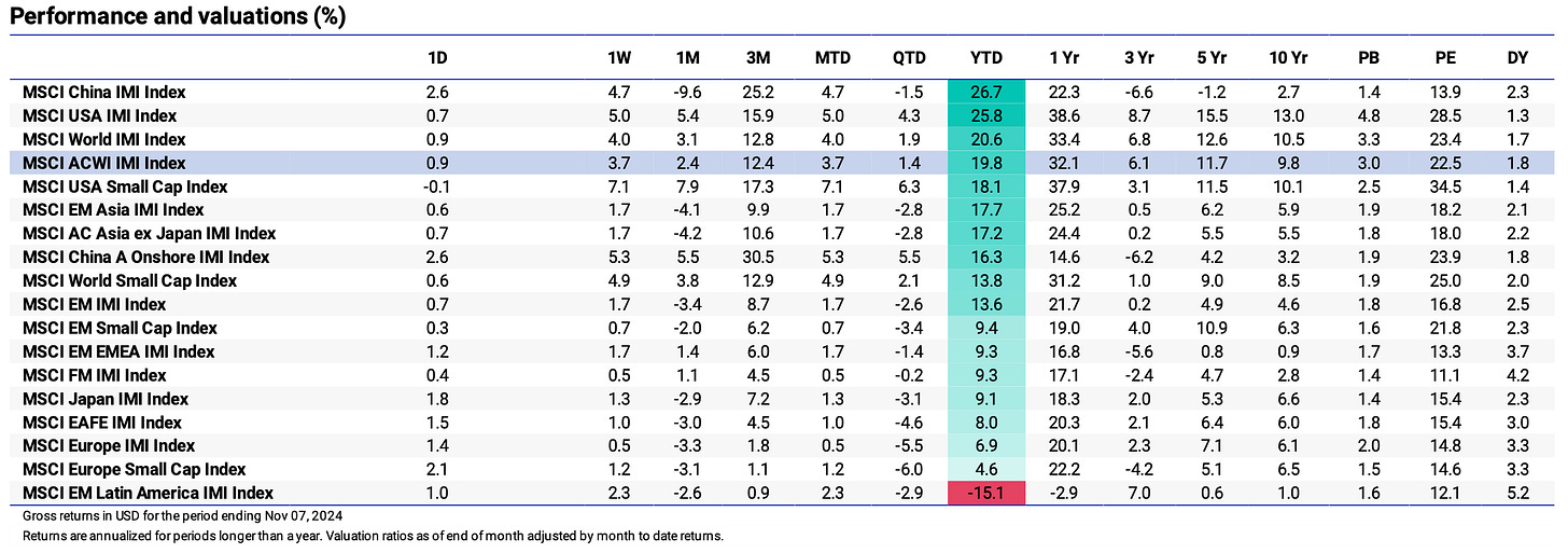 Last week painted a global picture of cautious optimism amid shifting economic policies. While U.S. markets rallied on election outcomes and renewed fiscal hopes, central banks around the world took action, reflecting mixed growth and inflation concerns. Emerging markets showed resilience, but contrasting narratives hint at ongoing challenges and opportunities.