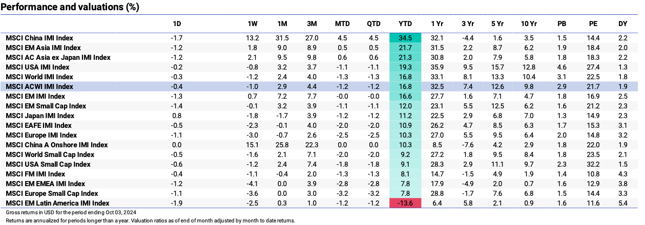 Emerging Markets: China’s stimulus efforts drove a significant rally in its stock markets despite continued weakness in factory activity. Investors should be mindful of China’s long-term structural challenges, but short-term opportunities may arise as the government continues to support economic recovery.