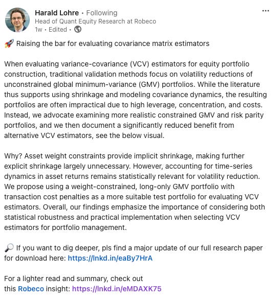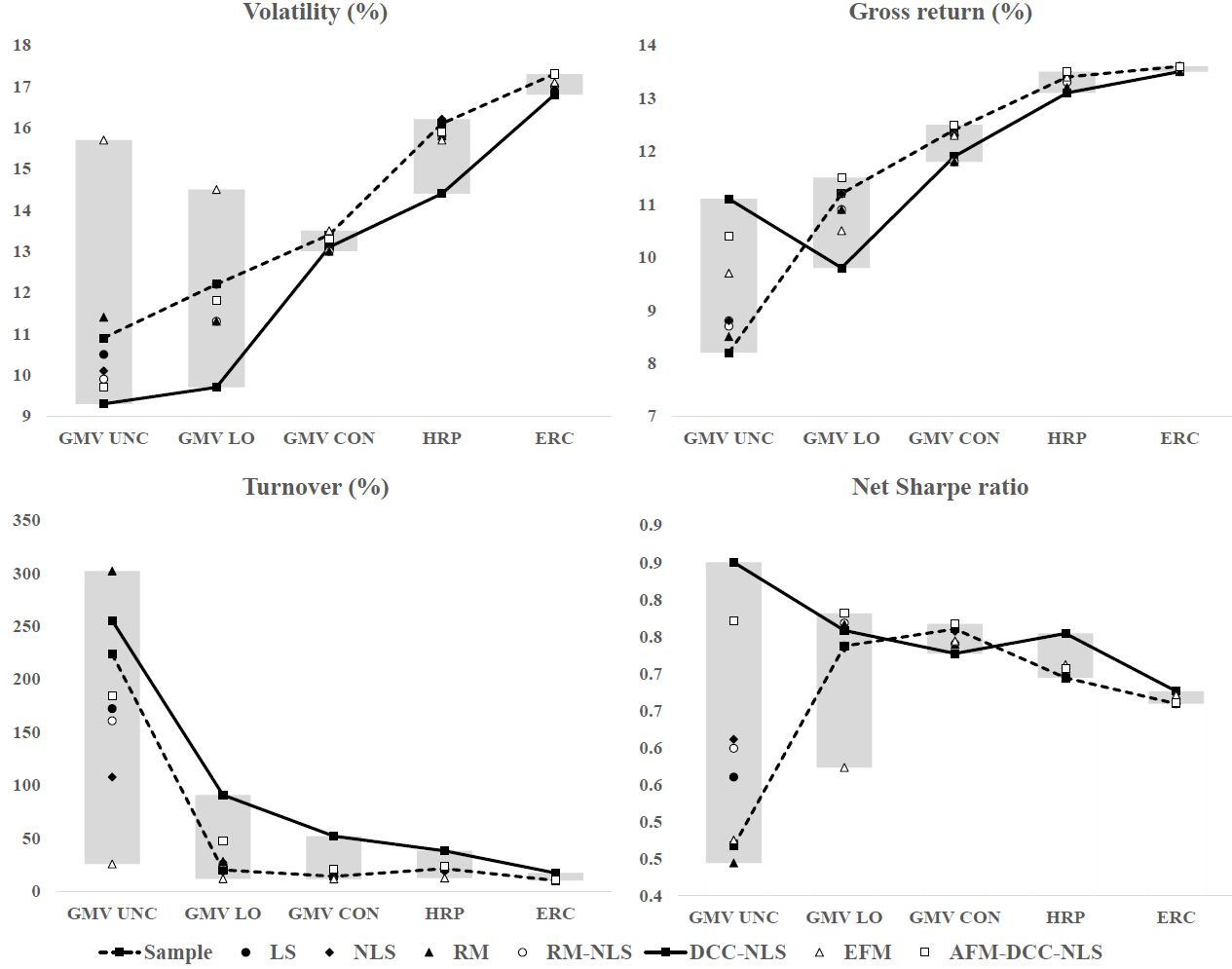 This week's chart is all about understanding how to make better investment portfolios by using variance-covariance (VCV) estimators. These estimators help us understand the risks of different assets and how they relate to each other. In the past, experts often used something called an unconstrained global minimum-variance (GMV) portfolio to try to reduce risk, but these portfolios have some big downsides—like high leverage, high concentration, and high costs—which make them unrealistic for most investors.